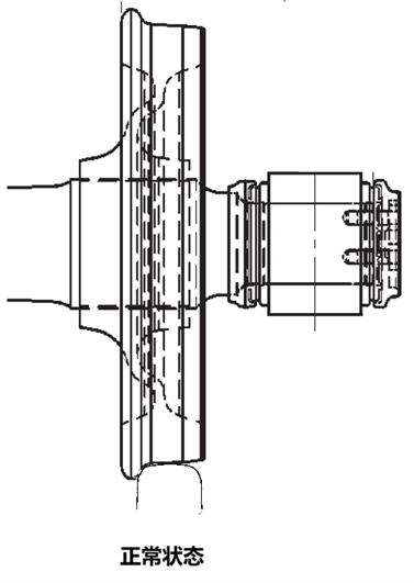 導(dǎo)向輪受進(jìn)給油缸的作用產(chǎn)生懸空效應(yīng)時(shí),其懸空的高度受打磨電機(jī)的角度、進(jìn)給油缸的下壓力大小以及砂輪厚度共同影響,并不懸空在固定的高度。圖三是正常狀態(tài)下的輪軌接觸狀態(tài),圖四是導(dǎo)向輪被略微抬高后的狀態(tài),圖五是導(dǎo)向輪被明顯抬高后的狀態(tài),圖五這種狀態(tài)易引起掉道。