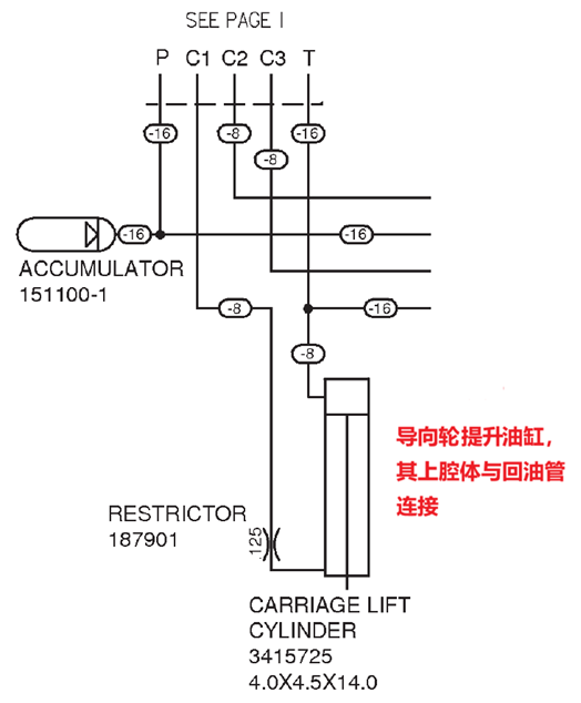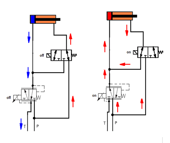 作業(yè)小車提升油缸控制閥是常見的兩位四通換向閥,其線圈在未得電時(shí),油缸的下腔體通過(guò)該閥與回油管連接,而上腔體是直接與回油管連接的,如圖六和圖七所示。因此,當(dāng)作業(yè)小車導(dǎo)向輪落到鋼軌上后,控制閥失電的情況下,提升油缸的上下腔體都與回油管連接,使作業(yè)小車處于自由懸浮狀態(tài)。